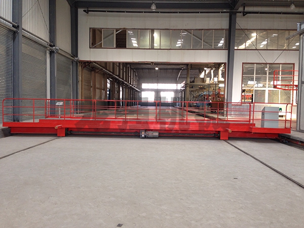 KPG滑觸線電動(dòng)平移換軌車供電方式是:在軌道側(cè)面開設(shè)地溝,地溝內(nèi)安裝安全滑觸線,地溝上鋪有單面用鉸鏈固定于地上的蓋板或安裝于地溝的側(cè)面。電動(dòng)平車運(yùn)行時(shí)通過安裝在地溝翻板裝置,將蓋板掀起,翻板裝置內(nèi)有同安全滑觸線集電器聯(lián)接的電纜。電動(dòng)平車通過后蓋板自動(dòng)放回地面,能保證無軌車輛順利通過。KPG側(cè)滑觸線電動(dòng)平車不受運(yùn)行距離的限制。將交流380V的安全滑觸線直接引入平車交流控制系統(tǒng),來控制平車的啟動(dòng)、停止、前進(jìn)、后退等。通過平車的移動(dòng)帶動(dòng)安全滑觸線的滑塊來實(shí)現(xiàn)給平車供電,安全滑觸線受安裝未知的限制,可以安裝在地溝內(nèi)側(cè)墻體上,來實(shí)現(xiàn)地溝內(nèi)的電源引入軌道平車上,操作系統(tǒng)為低壓AC36V電源控制。是車間流水生產(chǎn)線的 ;該平車適用于運(yùn)行距離不長(≤200m)、使用頻率極高、整車高度較低、流水線作業(yè)等場合。
