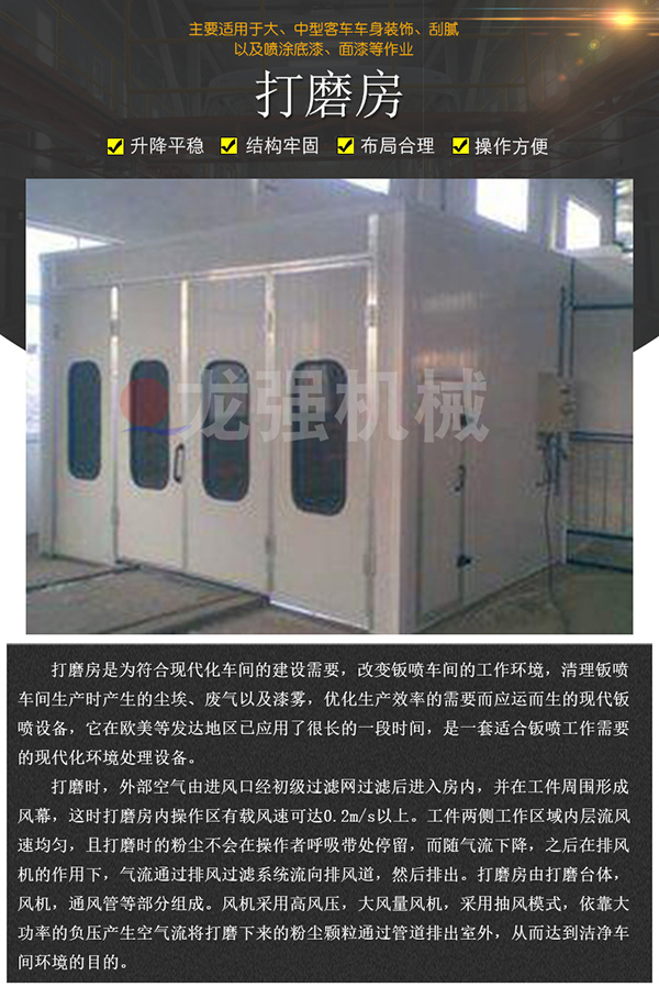 打磨房是為滿足現(xiàn)代化車間的建設(shè)需要,改善鈑噴車間的工作環(huán)境,清除鈑噴車間生產(chǎn)時(shí)產(chǎn)生的塵埃、廢氣以及漆霧,提高生產(chǎn)效率的需要而應(yīng)運(yùn)而生的現(xiàn)代鈑噴設(shè)備,它在歐美等發(fā)達(dá)地區(qū)已應(yīng)用了很長(zhǎng)的一段時(shí)間,是一套極適合鈑噴工作需要的現(xiàn)代化環(huán)境處理設(shè)備。