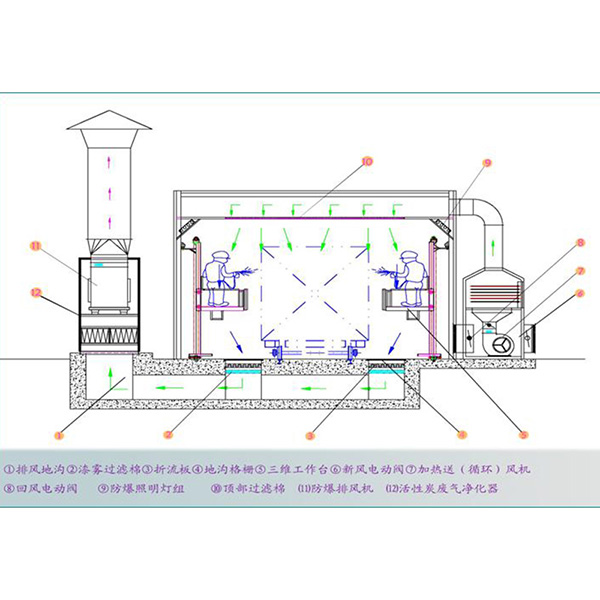 烤漆時(shí),將風(fēng)門(mén)調(diào)至烤漆位置,熱風(fēng)循環(huán),烤房?jī)?nèi)溫度迅速升高到預(yù)定干燥溫度(55℃-60℃)。風(fēng)機(jī)將外部新鮮空氣進(jìn)行初過(guò)濾后,與熱能轉(zhuǎn)換器發(fā)生熱交換后送至烤漆房頂部的氣室,再經(jīng)過(guò)第二次過(guò)濾凈化,熱風(fēng)經(jīng)過(guò)風(fēng)門(mén)的內(nèi)循環(huán)作用,除吸進(jìn)少量新鮮空氣外,絕大部分熱空氣又被繼續(xù)加熱利用,使得烤漆房?jī)?nèi)溫度逐步升高。當(dāng)溫度達(dá)到設(shè)定的溫度時(shí),燃燒器自動(dòng)停止;當(dāng)溫度下降到設(shè)置溫度時(shí),風(fēng)機(jī)和燃燒器又自動(dòng)開(kāi)啟,使烤漆房?jī)?nèi)溫度保持相對(duì)恒定。 當(dāng)烤漆時(shí)間達(dá)到設(shè)定的時(shí)間時(shí),烤漆房自動(dòng)關(guān)機(jī),烤漆結(jié)束。